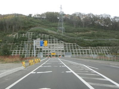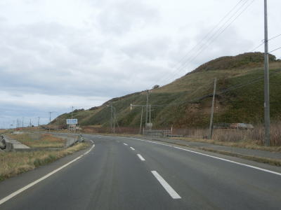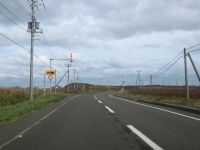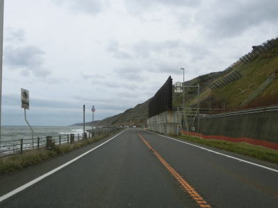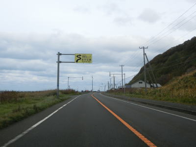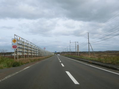 | 苫前グリーンヒルウインドパークを過ぎると内陸側も平地となり開けた場所を走る。緩やかなS字カーブを通過すると防雪柵が設置された区間を走る。降雪量の多い北海道ではあるが、意外に防雪柵が設置された区間は少ないように思えた。 | ||