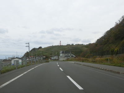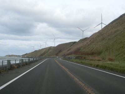 | 北海道r1062交差点から少し走ると内陸側の高台に複数の風力発電用風車が建っているのが見える。町営牧場の敷地内に建てられている風車の数は30基以上とかなり大規模な風力発電施設である。 | ||