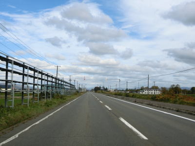 | 士別自動車試験場の北東を走っているが、樹木があるため敷地内を見る事はできない。もっとも“試験場”なので外から見えなくて当然だろう。緩やかな左カーブを曲がって試験場から離れて行く。 | ||