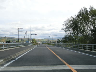 | 中名寄跨線橋の前後はやや急なS字カーブとなっているためか、北側に新たな道路を建設して線形改良を図る工事が行われていた。通行時は名寄方向は跨線橋を通っていたが、興部方向は新設の道路を走らされた。この道路が供用された後に跨線橋は撤去される予定である。跨線橋を過ぎると平坦な直線道路を走る。南側にはJR名寄本線跡があり、矢文駅と岐阜橋駅が置かれていた。下川橋を渡ると下川町の中心部に入る。 | ||