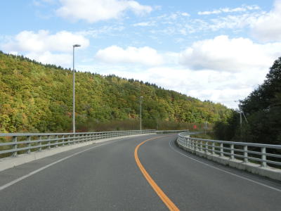 | 宇津集落で宇津駅跡の近くを通過した後に宇津川に架かる宇津橋を渡るが、走行した日は下流側で架け替え工事が行われていた。宇津橋を渡った先で北海道r883交差点を通過して緩やかな右カーブを曲がる。 | ||