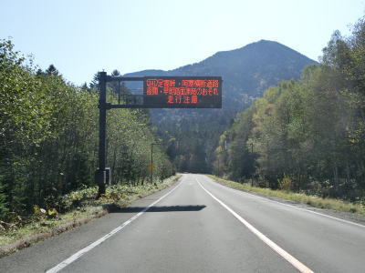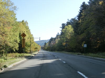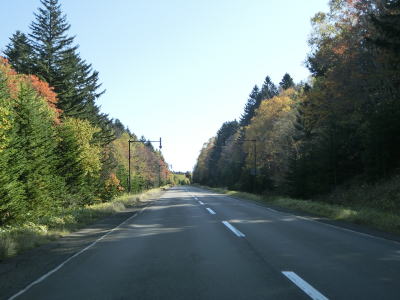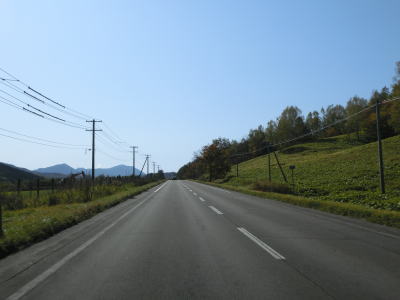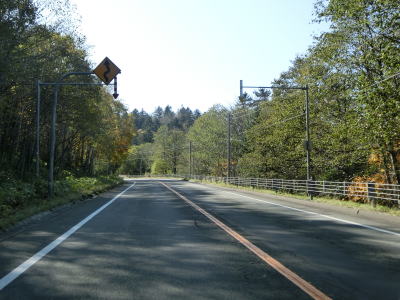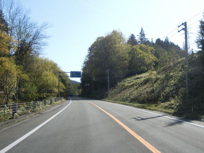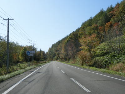| 尻駒別交差点からはR241が重複しているが、道路状況に変化はなく走りやすい2車線道路が続いている。沿線に家屋はなく直線道路をひたすら下って行く。鹿との衝突事故が多く発生しているようで、事故現場を発見した際は建設部に連絡するようにお願いする看板が設置されている。当該区間は昼間でもヘッドライトを点灯するように推奨されている。 | ||