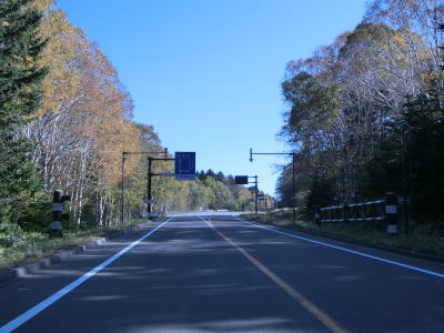 | 道の駅「あいおい」を通過する。道の駅の東には国鉄相生線跡があり、少し南に北見相生駅跡がある。相生線としての終着駅であったが、計画としてはさらに南進して釧路まで繋がるルートが構想されていた。 道の駅を過ぎて少し走ると北海道r768交差点を通過する。その後も緩やかな上り勾配の2車線道路が続いており、北向き車線の駐車帯、次いで南向き車線の駐車帯を通過する。後者の直後には閉鎖用ゲートが設置されている。 |