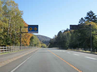 | 90.「R241阿寒横断道路 早朝・夜間凍結のおそれ 走行注意」 | 91.「下り坂スリップ注意」 | 92.西向き車線には登坂車線がある |