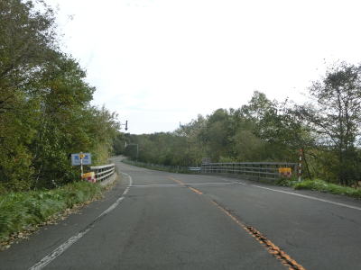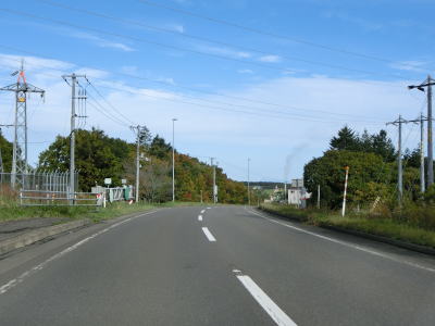 | 閉鎖用ゲート付近からは緩やかな下り勾配となる。沿線に家屋はほとんどなく牧草地が広がっており北海道らしい風景と言える。アップダウンを繰り返しているが勾配は緩やかなので走りにくさは一切感じない。JR標津線(の支線)の跡を横切ってからやや急な左カーブを曲がった後に新酪道路との交差点を通過する。 | ||