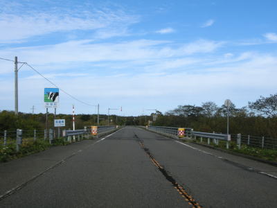 | 比較的規模の大きな尾岱沼集落を通り抜けると飛雁川に架かる飛雁橋を渡る。東側に見える海はオホーツク海の一部でもある野付湾である。野付湾に近い場所では防風柵(?)があるが、柵の向こう側が見えるメッシュタイプのものが設置されている。 | ||