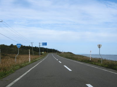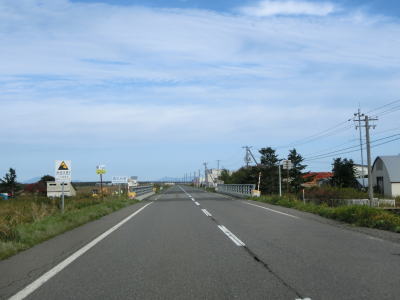 | 緩やかで小さなアップダウンを繰り返しながらオホーツク海沿いを淡々と走る。家屋が途切れる事なく続いているとは言え交通量は極めて少なく、ハイペースで流す事ができる。 | ||