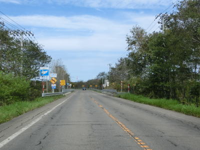 | 野付半島の根元に近くなると海岸線から離れて内陸に向かう。カーブの多い2車線道路を走っていると当幌橋を渡って標津町に入る。当幌川が別海町と標津町の境となっているが、野付半島にも町境があって根元付近は標津町でトドワラを含む半島の大部分は別海町に属している。 | ||