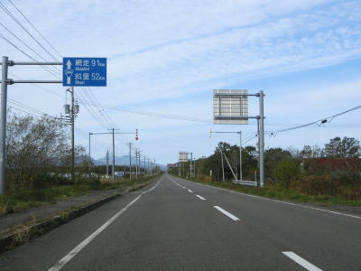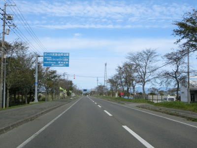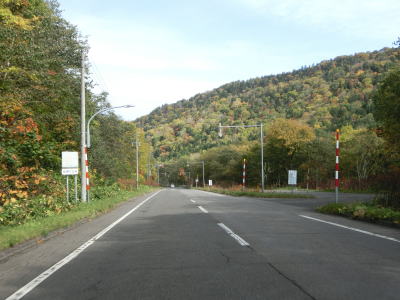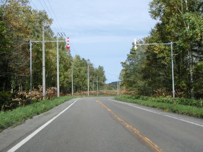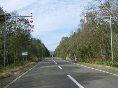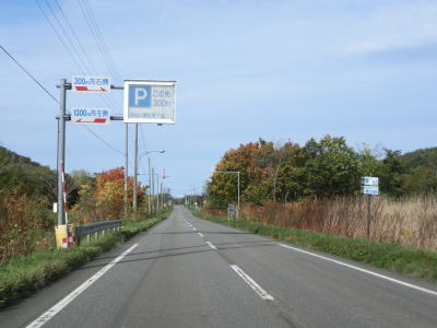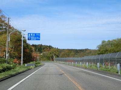 | 耕作地の間を走っていると閉鎖用ゲートを通過するが、南向き車線の市街地寄りに駐車帯が設置されている。北向き車線の駐車帯はそこから1000m離れた場所にあり、ゲート手前にはそれぞれの距離が示された標識が設置されている。その後緩やかな右カーブと左カーブを通過する。そのカーブ間を根北線が横断していたが、廃線となったのが1970年と約50年前のためその痕跡は確認できない。 | ||