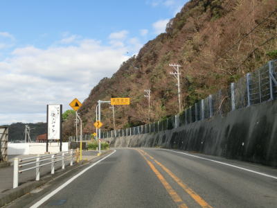 | 小佐集落を通り過ぎると海岸線沿いを走り、右ヘアピンカーブを曲がった後に新居集落に入る。豊浜漁港に連なるいくつかの連続する集落の中を走っていると愛知r281交差点を通過する。 | ||
