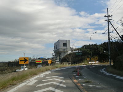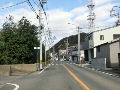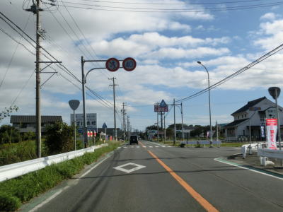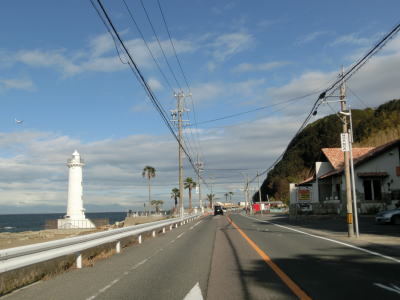 | 小野浦集落を通り過ぎて少し走ると野間灯台のすぐ傍を通過する。中部国際空港にも近く、離着陸する航空機も確認できる。しばらく海沿いを走っていると右の急カーブを曲がって冨具崎川の左岸を少し走り、左にカーブして橋を渡る。以降は沿線に家屋が密集している状態となり、歩道がない事もあって若干の走りにくさを感じる。 | ||