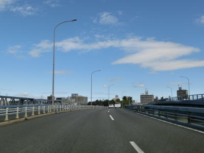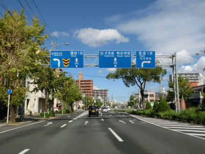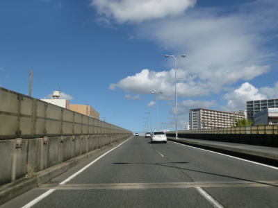 | 内田橋1交差点を過ぎる片側2車線道路になるが、すぐに左側に車線が増える。ただし、その増えた車線は新内田橋南交差点では側道になってしまうので実質的には片側2車線と言える。新内田橋で新堀川を渡ると同時に愛知r225の内田橋北交差点の上を通過する。新堀川は区境となっており新内田橋以北は名古屋市熱田区に入る。 新内田橋からの勾配を下って平面道路に降りると内田橋北交差点からの側道と合流するが、側道も2車線あり信号機で交通を制御されている。側道に合流した直後にR1・R19・R22熱田神宮南交差点に至る。この交差点がR247の起点である。起終点ともにR1との交差点だが、交差点間の距離はR247の152km(約4時間)に対してR1は半分以下の62km(約2時間)である。東名+名古屋高速を走行すると距離こそR1よりも増えるが、1時間強で往来可能である。 |