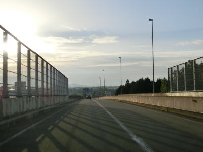 | 岩戸トンネルを出て片側2車線道路を少し走ると岐阜r77との交差点を通過する。交差点の上を横切っている跨道橋はr77からR248(実質R156)の岐阜市街方面を結ぶランプである。また、逆のR248(実質R156)の岐阜市街方面からr77へは常時左折可能なため信号機を介さずに通行できる。 r77からの車線が合流した後で右側車線が減少して片側1車線道路になる。岐阜東パイパスの計画ではおそらく片側2車線になっていると思われ、中央分離帯に当たる部分が拡幅用地なのだろう。 |
