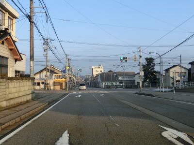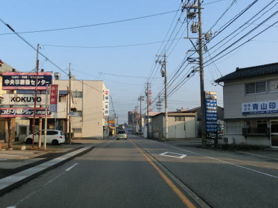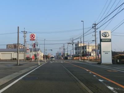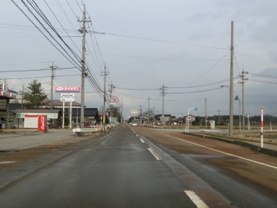 | 家屋が密集している中で石川r129滝港口交差点を通過する。r129が海沿いを走っているが、滝町集落までの行止り県道である。北陸鉄道能登線跡はr129沿いに進み滝崎を海に沿って廻るルートを取っている。R249はそれに対して内陸を大きく右にカーブしており、進行方角を再び北に戻す。交通量の少ない2車線道路を淡々と北上する。 | ||