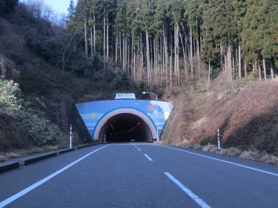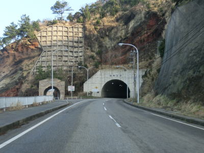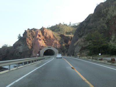| 集落が途切れた状態を走っていると赤神トンネルをくぐる。赤神というのはこの辺りの地名のようだが、赤い岩盤に由来しているのだろうか。トンネルが穿たれた岩盤も特徴的な赤色である。そんな赤神トンネルを出て右カーブを曲がると道の駅「赤神」を通過する。旧道と思われる道と現在の国道に囲まれた、比較的規模の小さい道の駅である。やや中途半端な場所だがこれ以上続けるとpart2が長くなりすぎてしまうため、ここで一旦区切って次のpartに譲る。 | ||