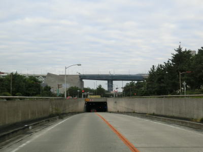 | 中高層のマンションが多く建っている場所を走っていると前方に明石海峡大橋が見えてくる。その手前で側道が分岐して本線はアンダーパスを通過する。明石海峡大橋の真下はこのアンダーパスの中である。R28のバイパスという位置付けでもある神戸淡路鳴門道だが、R28から直接出入りする事はできない。なお、アンダーパスの上には兵庫r487舞子公園前交差点と他に市道との交差点が2ヶ所ある。 アンダーパスから平面道路に戻ると山陽電鉄がJR山陽本線をオーバーパスしてきて、今度は山陽電鉄が隣接並走状態になる。山陽電鉄にはJR山陽本線が隣接しており、さらに山側にはr487が並走している。 |