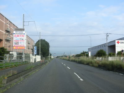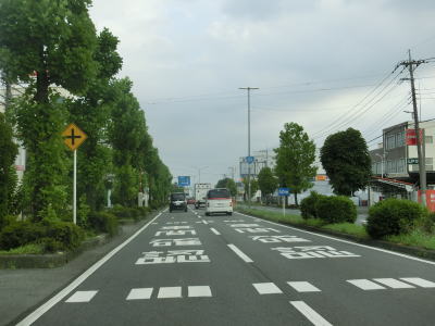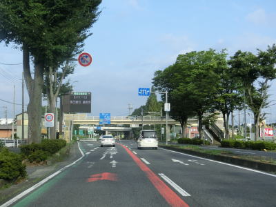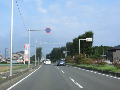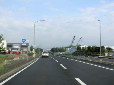 | E17関越道の本線の沖中橋をくぐって引き続き片側2車線道路を走る。中央分離帯には植栽があり両側の歩道にも比較的背の高い街路樹がある。周辺には一般家屋は少なく物流倉庫や工場が多い。平日であればトラックの通行量が多い事は想像に難くない。 | ||