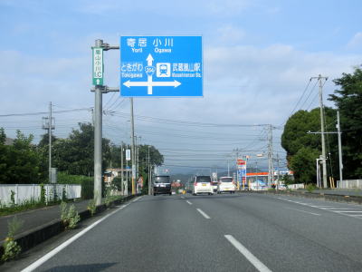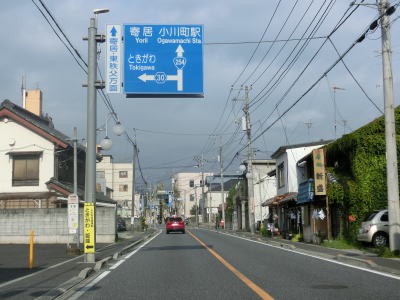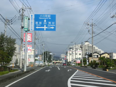 | 右カーブの先で埼玉r11相生町交差点を右折して本庄・寄居方面に進む。やや狭苦しい2車線道路を約300m走ると町道との小川町駅西交差点を左折する。案内標識が小さく目立ちにくいため道なりに進んでしまわないように注意を要する。もっとも直進してしまってもすぐに小川町駅に突き当たるためルートミスに気付く事ができる。 | ||