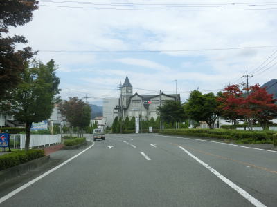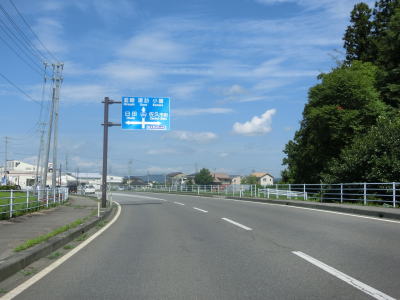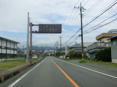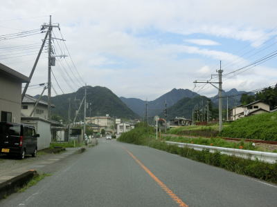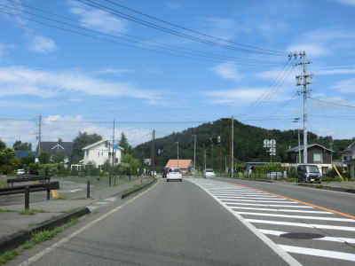 | 長閑な風景ながら内山峡と呼ばれており露出した岩山が見られる。周辺の家屋が増えてきた所で旧道との交差点を通過する。ウオッちずでは県道として表記しているが、案内標識がなく番号は不明である(長野r120?)。旧道との交差点以西も対面2車線道路が続いているが、車線幅が広くなりさらに走りやすくなる。 | ||