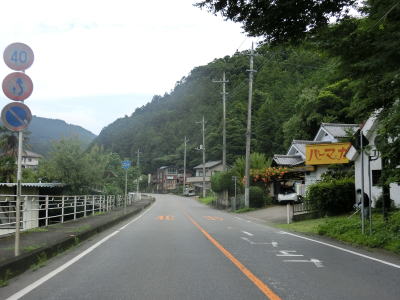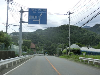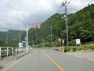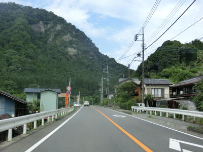 | 道の駅を過ぎてからも2車線道路が続いており沿線の家屋は多いもののそれなりに走りやすい道路状況である。群馬r193とを繋ぐ町道との石渕交差点を通過して石渕橋を渡ると鐙川の右岸に移る。下仁田町の中心部に近付くと幅員減少の警戒標識が立っており、その先で路側帯がなくなる。 | ||