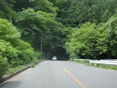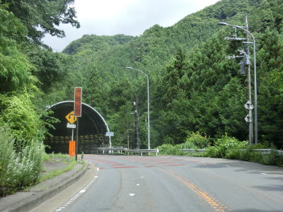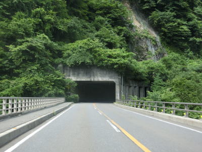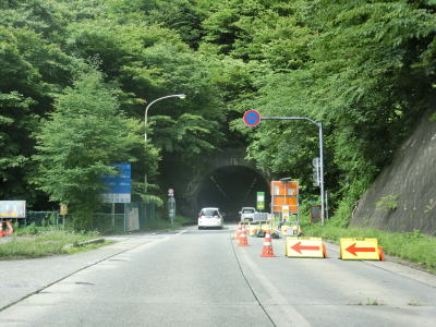 | 工事のため片側交互通行規制が敷かれていた16号橋を渡った先で内山隧道をくぐる。トンネルの手前には簡易駐車場があるが、工事関係者が使用しており工事期間中は利用禁止と思われる。 内山隧道で内山峠の南を抜けると長野県佐久市に入る。トンネルを出た直後に旧道と合流し、閉鎖用ゲートを通過する。長野県側にも簡易駐車帯があり、その隣には廃ドライブインがある。 |