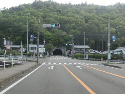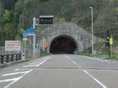 | r52交差点を右折して板取川を渡った先にはタラガトンネルが口を開けて待っている。全長4571mという長さは“無料で通行できる国道のトンネル”の中ではR194寒風山トンネルに次いで2番目に長い。扁額がなく味気ない外観の抗口から中に入ると上りが続いており、郡上市に入った辺りで下りに転ずる。そのためカーブは緩やかで直線的なものの反対側の抗口を見通すことはできない。 トンネルを抜けてもセンターラインのある2車線道路だが、約300m先で道幅が狭くなる。手前には大型車の転回場が設けられており、万が一トンネルをくぐってきてしまっても転回して引き返す事ができる。なお、狭路区間は連続雨量120mm・時間雨量60mm以上で通行止になる。 |