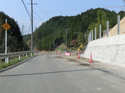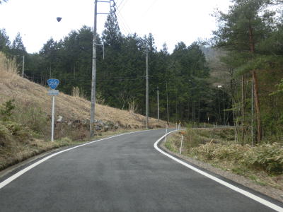 | 最初の家屋以降も1.0車線幅の狭路が残っている。勾配もややきつく急なカーブも多いが、周囲には家屋や田畑が存在しており見通しの良い場所が多い。基幹農道との交差点を過ぎて程なくしてセンターライン付きの2車線道路になるが、長くは続かない。2車線化工事が行われている真っ最中だったが、工事現場の先にも狭路が残っている。 | ||