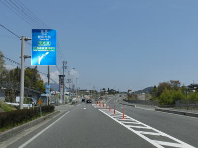 | 緩やかな上り勾配を走り下りに転ずる峠部分で飯田市に入る。緩やかな勾配を下り切った所で右にカーブする本線と側道とに別れる。案内標識には本線にのみおにぎりが表記されているが、側道の現道もまだ国道の指定を受けているはずである。という事で今回は側道に入り現道を走行している。 | ||