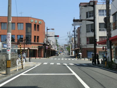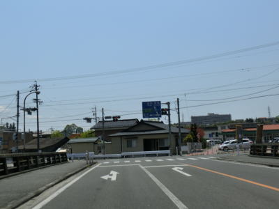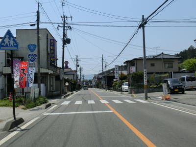 | 中央通り2・3交差点からはR151との重複区間になり、交差点の近くにR151とR256の串刺しおにぎりが立てられている。継ぎ接ぎ国道故に多くの国道と重複してきたR256だが、R156重複区間を除いて串刺しおにぎりが設置されている点は驚くに値する事である。飯田駅から続く直線道路を店舗兼住宅が並ぶ中を緩やかに下っていく。勾配がなくなると同時に右の急カーブを曲がる。 | ||