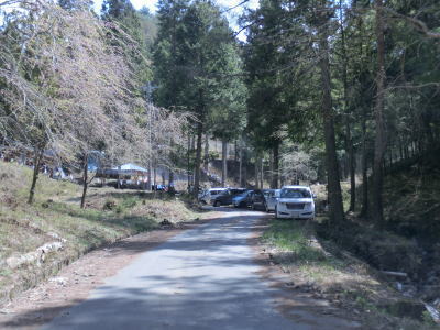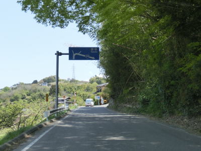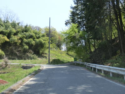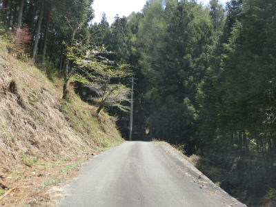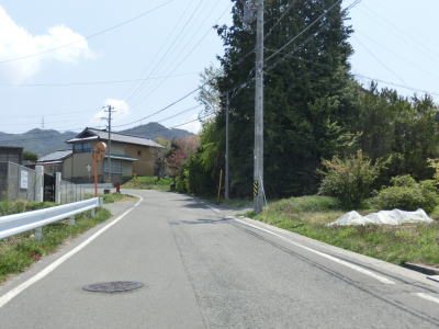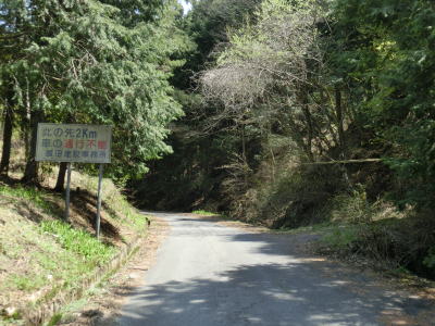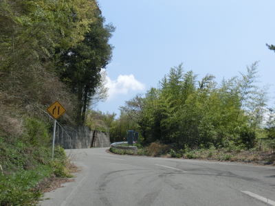 | 観世音堂付近の右急カーブを曲がってからは道路状況が悪化する。観世音堂より奥に進入する車両は少ない事は想像に難くない。道幅は観世音堂以西と大きく変わらないが、路上の落ち葉が大量に堆積しており、轍部分だけなんとかアスファルトが見えている状態である。この事からも走行する車両が少ないながらも皆無ではない事が推測できる。観世音堂約300m走るとおにぎりが立っているのを確認できる。おにぎりは1本のみで端点方面を向いており、端点に向かっている場合はその裏面を見る事になる。 | ||