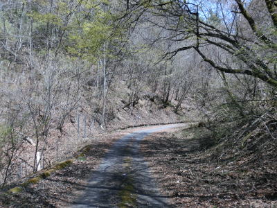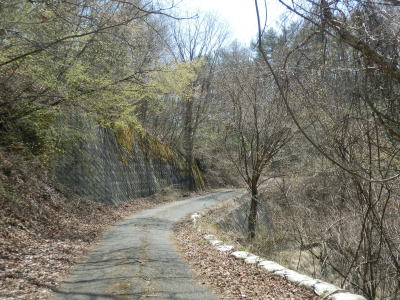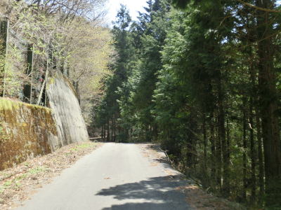 | 急カーブは多いものの勾配は比較的緩やかで落ち葉が堆積しているため走りにくいが恐怖を感じる程ではない。1ヶ所だけ路上河川が横切っているが、前日の雨にも水が流れておらず落ち葉が堆積しているため、知らない人が見れば単なる凹凸にしか見えないだろう。その後もガードレールのない1.0車線狭路をいくつものヘアピンカーブで標高を上げながら端点に向かう。 | ||