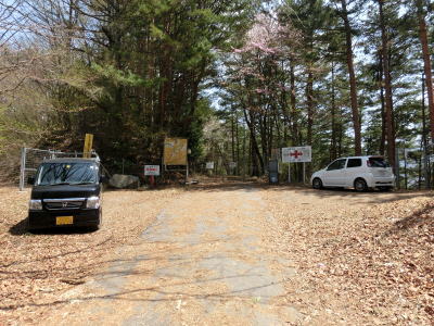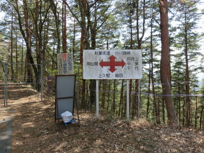 | 車両通行不能を警告する標識に示された通り、約2.0kmで広場のような場所に出る。看板等の他に前方の2本の道路にはゲートが設けられており車両での進入ができない。ゲートと言っても車両の進入を阻むものではなく、有害鳥獣が人間の生活圏側への進入を阻むものである。よってゲートは開閉可能で、正面の秋葉海道・小川路峠方面を除いて鍵がかけられていなかった。鍵に関しても飯田市役所か飯田建設事務所で借りる事も可能なようだ(ただし、単純に奥に進みたいから貸して下さいが通じるかどうかは不明)。 ウォッちずではこの交差点から先も国道を示しているが、正面の小川路峠方面ではなく左側の照仙閣方面となっている。現地の標識等の設置位置からは小川路峠方面が国道のように思える。どちらの道路も最終的には合流するのだが、道路状況の良し悪しで言えば小川路峠方面の方が幾分かマシである。地元企業が設置したと思われる秋葉海道の案内図の右側に標識用に支柱が立っており地名の補助標識の上に不自然なスペースがあるが、おそらくおにぎりが設置されていたのではなかろうか。であれば、やはり小川路峠方面の道路が国道なのだろうか。車両で進入できる状態であればどちらに進むべきか悩んだであろうが、どうせこれ以上進めないため結論を出さず、車両進入限界地点=飯田市越久保側端点としておく。なお、ウォッちずではこの先約2.2kmまで(小川路峠方面の道路経由)は車道として描かれている。 |