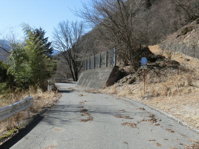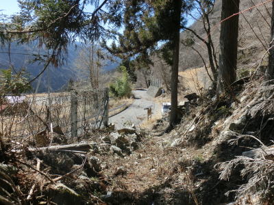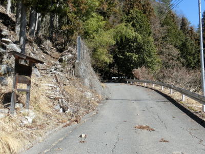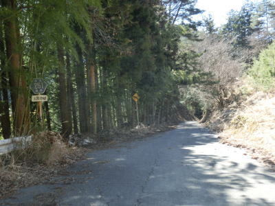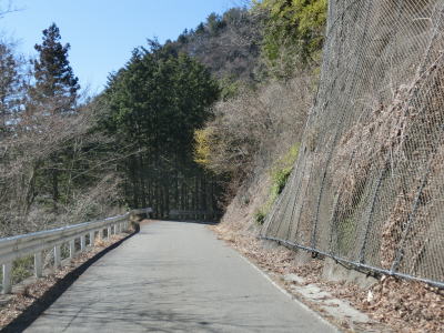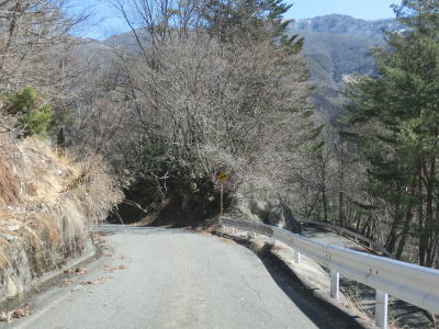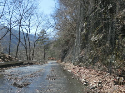 | 登山道入口の下にある家屋の出入口の道路との交差点を過ぎて少しは緩やかな勾配とカーブのただの狭路だが、ヘアピンカーブ2ヶ所で一気に標高を下げる。その後は断崖を走っており2日前の雨の影響なのか路面が水浸しの箇所もあった。 | ||