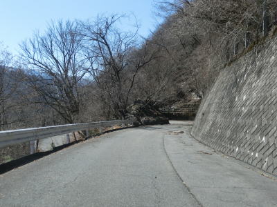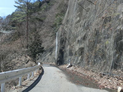 | 断崖区間は1.0車線幅と特に道幅が狭く、山側には比較的大きな落石も見られた。ガードレールが設置されているため転落の危険性は低いが、落石の直撃もしくは落石を踏んでパンクする可能性はある。勾配が緩やかで日光が差し込む明るい雰囲気である点が多少走りやすさに貢献している。 | ||