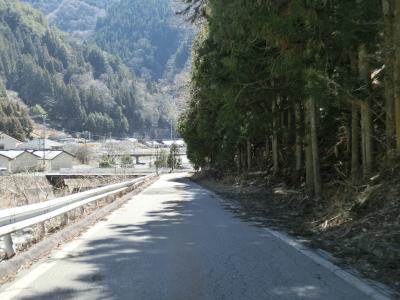 | 再び2ヶ所のヘアピンカーブを通り、杉の木が生い茂っている箇所を過ぎると茶畑が見えて人の生活感を感じられる場所に出る。伊藤谷を渡る前後で左に直角にカーブして、そのまま伊藤谷の右岸を走る。前方には旧上村の中心部が見えてくる。 | ||
