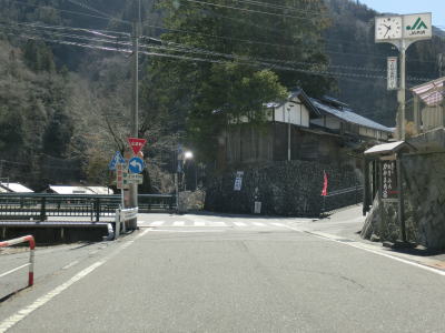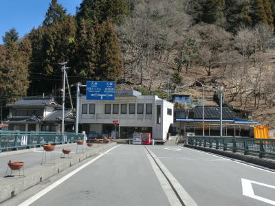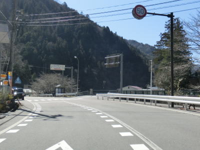 | センターラインはないものの道幅が2.0車線にまで広がってすぐに市道との十字路に至る。R256は一旦停止してから左折して向橋を渡る。上村川の対岸に渡った所でR152役場交差点に突き当たる。この交差点がR256の終点である。 | ||
