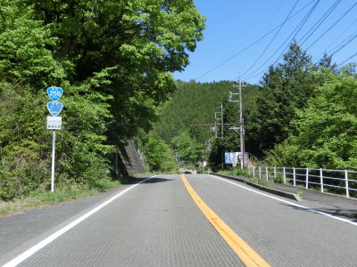 | 緩やかなカーブと勾配の2車線道路を走っているとR418バイパスとの交差点を通過する。R418は平谷村と根羽村が案内されているが、R418のバイパスとして開通しているのは1km強しかなく、それ以東は愛知r101となっている。バイパスとの交差点からはやや急な上り勾配を走っているとR418現道との交差点を通過する。現道は分断する事なく続いているが、案内標識の地名は消されている。 | ||