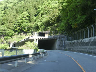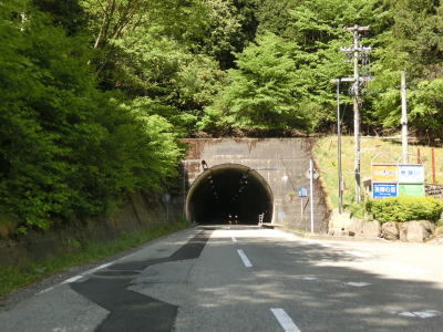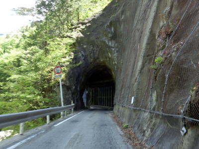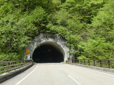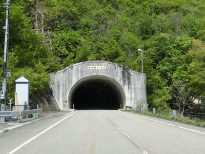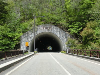 | 馬瀬川沿いの狭路を走っているとカーブや幅員減少を知らせる標識や看板が複数立っている。見通しの悪い右カーブを曲がった先には地図にも載っていない制限高3.6mの隧道をくぐる。岩盤をくり抜いただけの隧道にロックシェッドが接続している。内部は1.0車線と狭く乗用車の通行には問題ないが離合はできない。大型車両だと上部が隧道内壁に接触する可能性があり、通常不能の警告は正しいだろう。隧道を出てからも馬瀬川沿いの狭路が続いている。 | ||