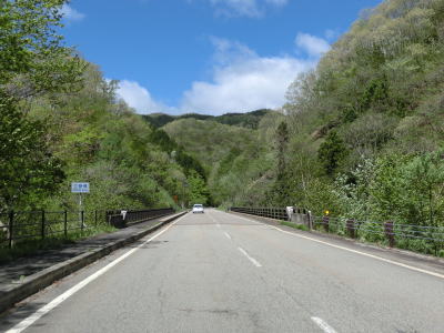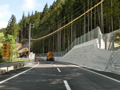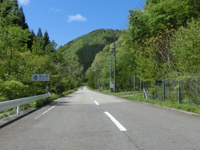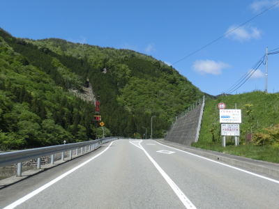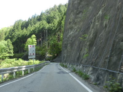 | 無笹集落からはセンターラインが復活して2車線道路になり、直線の見通しの良い快走路となる。約2.0km走ると新しい舗装と法面となり、その先には拡幅工事現場があった。走行した時は法面を削る工事が行われており片側交互通行規制が敷かれていた。工事現場から先はこれまで通った狭路よりもさらに狭くなっており、乗用車同士の離合にも支障のある道幅である。しかしここはまだ大型車通行不能箇所ではない。 | ||