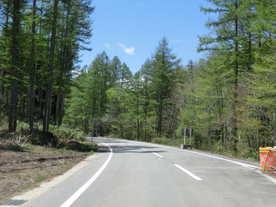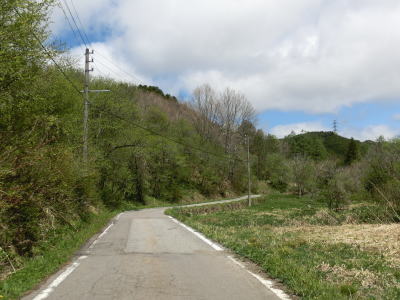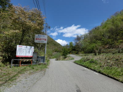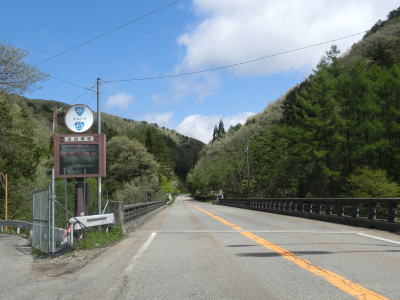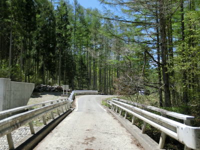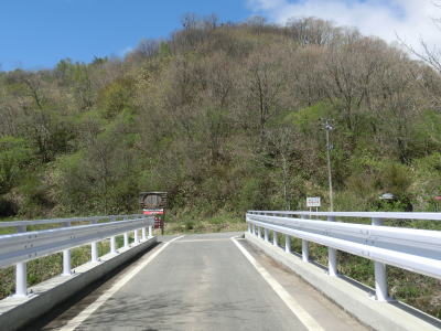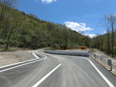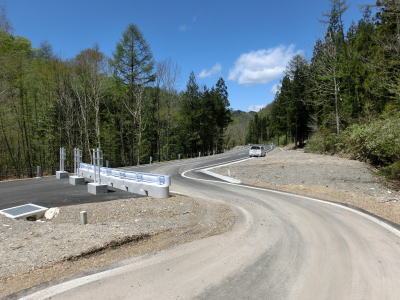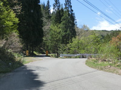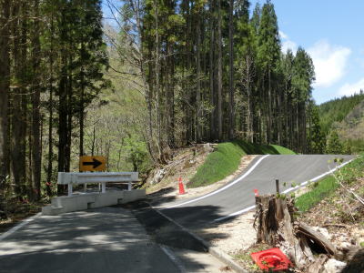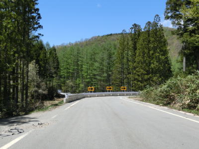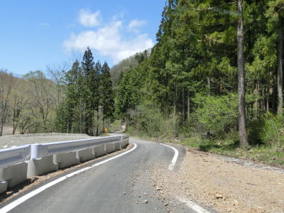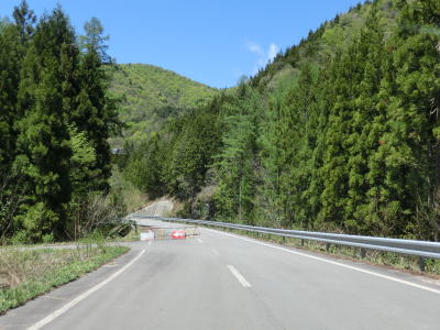 | 橋の西詰でバイパス予定線と合流してからは少し年月の経った舗装の2車線道路となる。2009年8月23日のR472トレースの際はここで工事が行われていたため引き返している。と、さらりとR472が出てきたが、麦島峠を含む分断区間はR472が重複している。 2車線道路を約900m走ると片側車線だけを塞ぐ形でバリケードが置かれている場所に至る。道路そのものはバリケードの奥にも続いているが、カーブの先の見えない場所までしか続いておらず通り抜ける事ができない。よって2014年5月の時点では左折しなければならない。 |