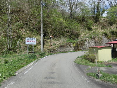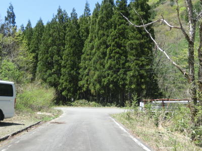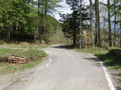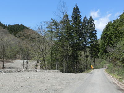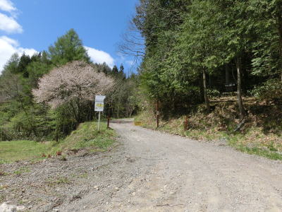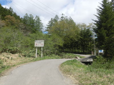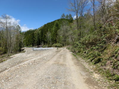 | 旧荘川村側の端点からレポを再開する訳だが、迂回ルートはr73まで戻ってからr73を北上して高山清見道路の高山西ICから東海北陸道に進み、荘川ICで降りてR158を走るルートが通行できる可能性が高くかつ時間的に最短である。その距離約61kmに達する。わずか数キロの分断区間の先に行くために61km、約1時間半も走らなければならない。 そして旧荘川村側端点も地図によって場所が異なっているので厄介である。旧清見村側端点をスーパーマップルのものにした関係で、こちら側もそれに準じた位置を端点としている。が、特に目印も何もない場所なので、その役割を担いそうな高山市の保安林内作業許可標章が立っている場所を端点とした。R158との三尾河交差点からだと約3.8kmの距離である。なお、道路そのものはさらに奥に続いている。 |