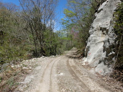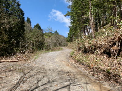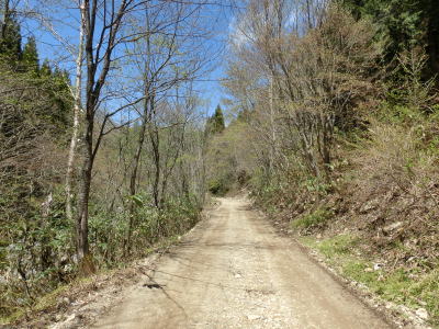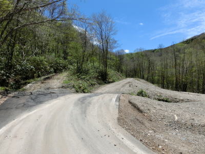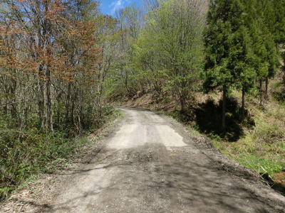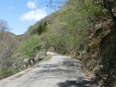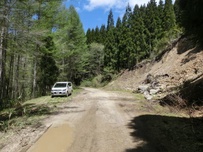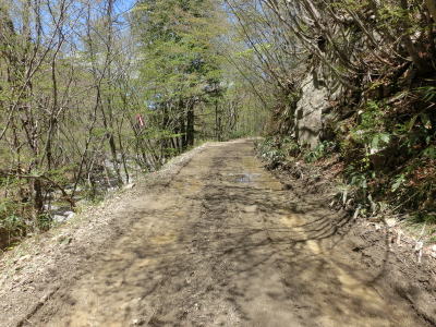 | 約200m進むとやや広くなっている場所を通るが、崩れたまま放置されている法面が確認できる。山肌むき出しで落石防止対策がなされていないが、補修された法面も見られる。崩れた際に通行に支障があったため補修されたのだろう。谷筋を走っているが、日が射しこんでいるため雰囲気は明るい。そのためぬかるんだ場所は少ないが、それでも泥濘と化している場所がない訳ではない。降雨中や直後の路面はもっとマディな状態になっている事だろう。 | ||