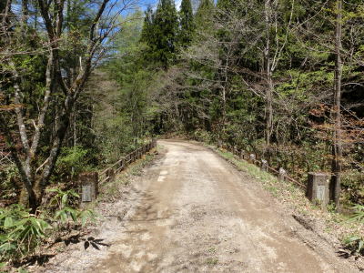 | という訳で他の分断国道と同様に点線区間を通り抜けてきたと仮定してレポを続ける。庄川沿いのダートで道幅は1.0車線幅しかなく狭い。所々に退避できるスペースはあるが、交通量を考えれば充分な間隔かもしれない。地図を見る限りは山中峠を経て郡上市の旧名宝村に抜けられる。また、この日は10トンダンプが走行していたのを目撃している。 端点(仮)を後にして1.0車線幅のダートを進んでいると古屋敷橋で古屋敷谷を渡る。昭和39(1964)年竣工なのでちょうど50年が経過している。橋上部分は舗装されているはずだが土が堆積しておりダートと何ら変わらない状態になっている。その後も庄川に沿って狭路を走る。舗装すらされていない状態にあってはガードレールはもちろんデリニエーターすら設置されていない。 |