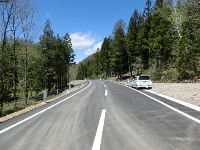 | 舗装面が新しく改良されて間もないと思われる2車線道路になるが、このまま終わるはずもなくセンターラインがなくなり上り勾配のS字カーブを曲がって従来の1.0車線幅に戻る。センターライン区間から真っ直ぐに庄川を渡る方向にはバイパス工事箇所があり、どうやらバイパスは庄川の左岸に通る計画のようだ。 | ||