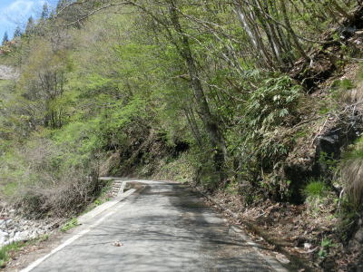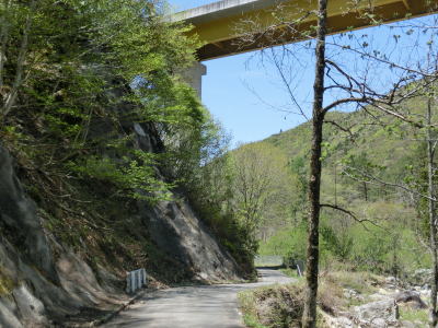 | 庄川の右岸の1.0車線幅の狭路を走る。ガードレール等の転落防止対策はされていないが、万が一川に転落しても落差が大きくないため、落ちたら死ぬ事態になる可能性は低い。約300m程狭路を走ると不自然な右カーブと勾配を上って新しい舗装の2車線区間を走る。すぐ左側には閉鎖された旧道が走っており、100m強で右にカーブしてから狭くなり古い舗装の道路に合流(?)する。 | ||