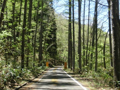| バリケードの手前を左折すると杉林の中の1.0車線道路とまさに酷道と言わんばかりの道路状況になる。「路肩注意」と「落石注意」の看板が酷さに花を添えている。杉林を抜けると空が開けて前方には高い位置を走っている東海北陸道の高架の下を通過する。当然ながらインターでの接続はない。高架から約350m程走ると軽岡峠を通る旧道との交差点を道なりに左へ進む。逆方向からの走行であれば案内のないT字路を右折する形になるのでルートミスに注意が必要である。 | ||