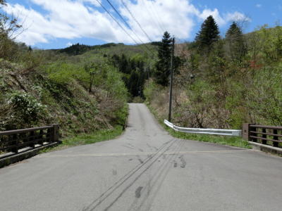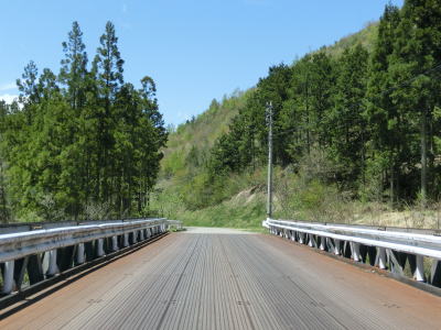 | 旧道との交差点からは1.5車線と道幅は狭いものの見通しの良いストレートが待っている。中ほどに退避所が設けられているが、そんなものが必要な程の交通量があるのだろうか。もっとも走行した日は釣人と思われる駐車車両は複数見られたので、時期や天候によっては場所の割に通行車両があるのかもしれない。ストレートと終わりは右にカーブしており、旧道なのかどうかわからない道路が交差している。その先で庄川を渡るが、路面が鉄板という仮設橋のような状態である。 | ||
