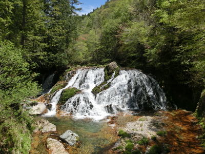 | 仮設橋もどきから先も1.5車線幅と狭いが、2車線分の用地は確保されているようで右側には未舗装のスペースがある。そのスペースは魚帰り橋まであるが、橋自体はセンターラインはないものの2車線分の幅で造られている。魚帰り橋からは名称の由来となった魚帰滝を見る事ができるが、バイパスが開通して交通量が多くなれば橋上に停車する事も出来なくなってしまうかもしれない。 | ||