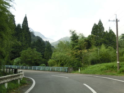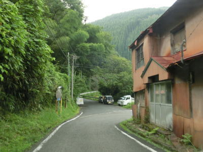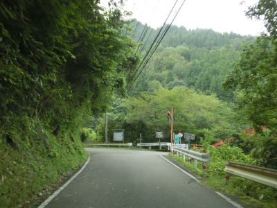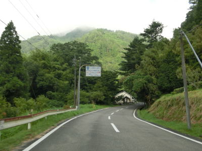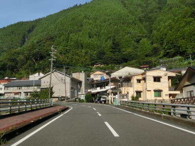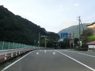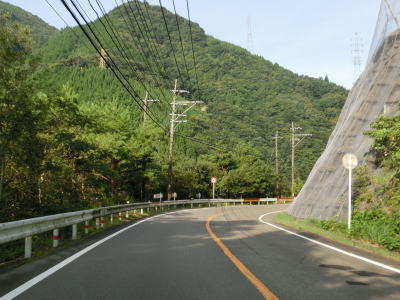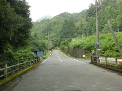 | 吉野橋からの2車線区間は意外に長い距離であり、小崎川の左岸の谷筋を快走する。飯干峠区間が未改良で狭くてカーブが多いと注意を促す標識が立てられているが、車両の大きさによる規制については言及されていない。2車線快走路で川の口下、川の口上を通過するが、この集落が飯干峠手前の最後の集落である。 | ||