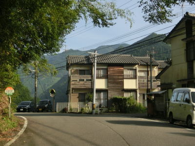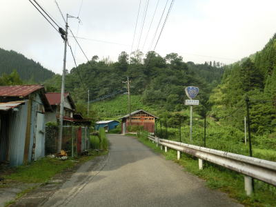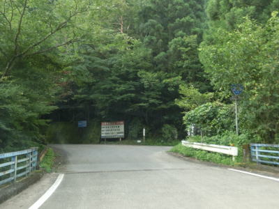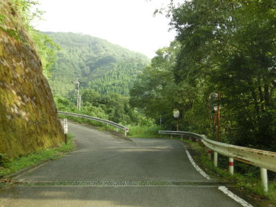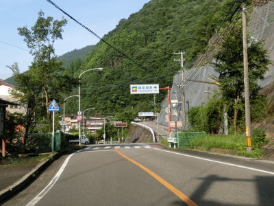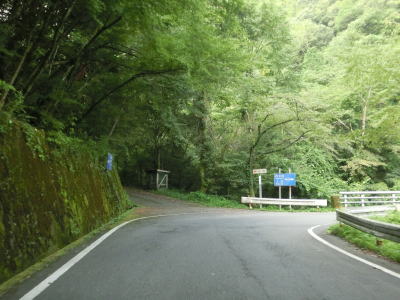 | 川の口上集落の南端付近で川の口橋を挟んだ左ヘアピンカーブを曲がる。橋の先には村道が交差しているが、その脇に4tロングを含む大型車通行止の看板が設置されている。該当する車に乗っていたとして、通行止だから引き返せと言われても困るような場所である。 | ||